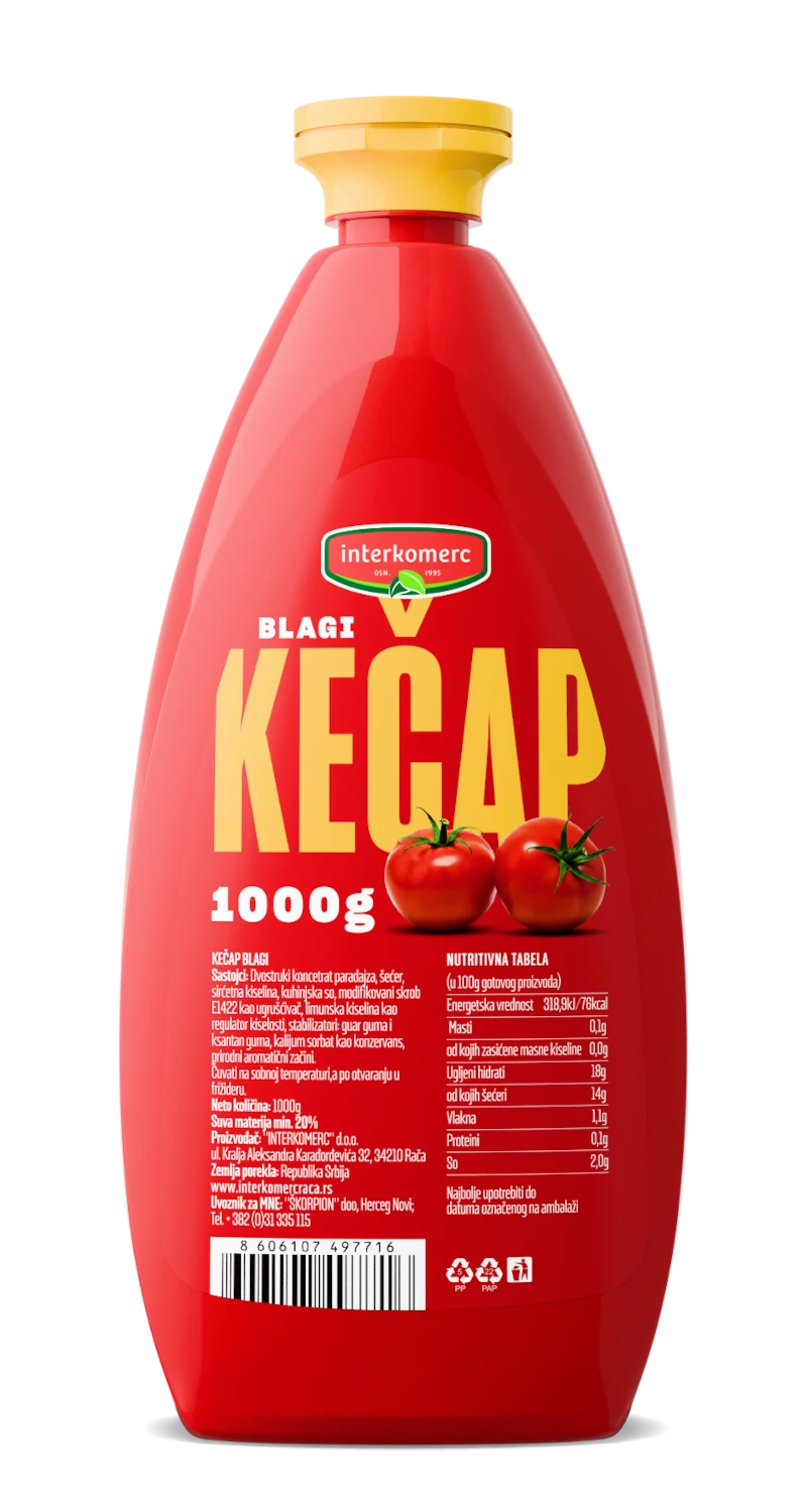 Sastojci: Dvostruki koncentrat paradajza, šećer, sirćetna kiselina, kuhinjska so, modifikovani skrob E1422 kao ugrušćivač, limunska kiselina kao regulator kiselosti, stabilizatori: guar guma i ksantan guma, kalijum sorbat kao konzervans, prirodni aromatični začini.
