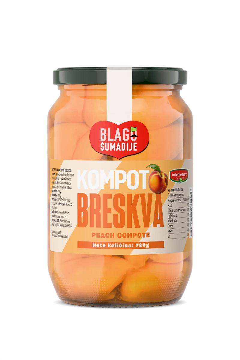 Kompot od domaće breskve, manje sladak, pasterizovan, 720 g.
