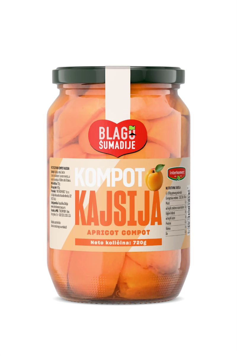 Kompot od domaće kajsije, manje sladak, pasterizovan, 720 g.
