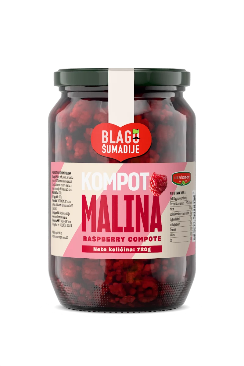 Kompot od domaće maline, manje sladak, pasterizovan, 720 g.