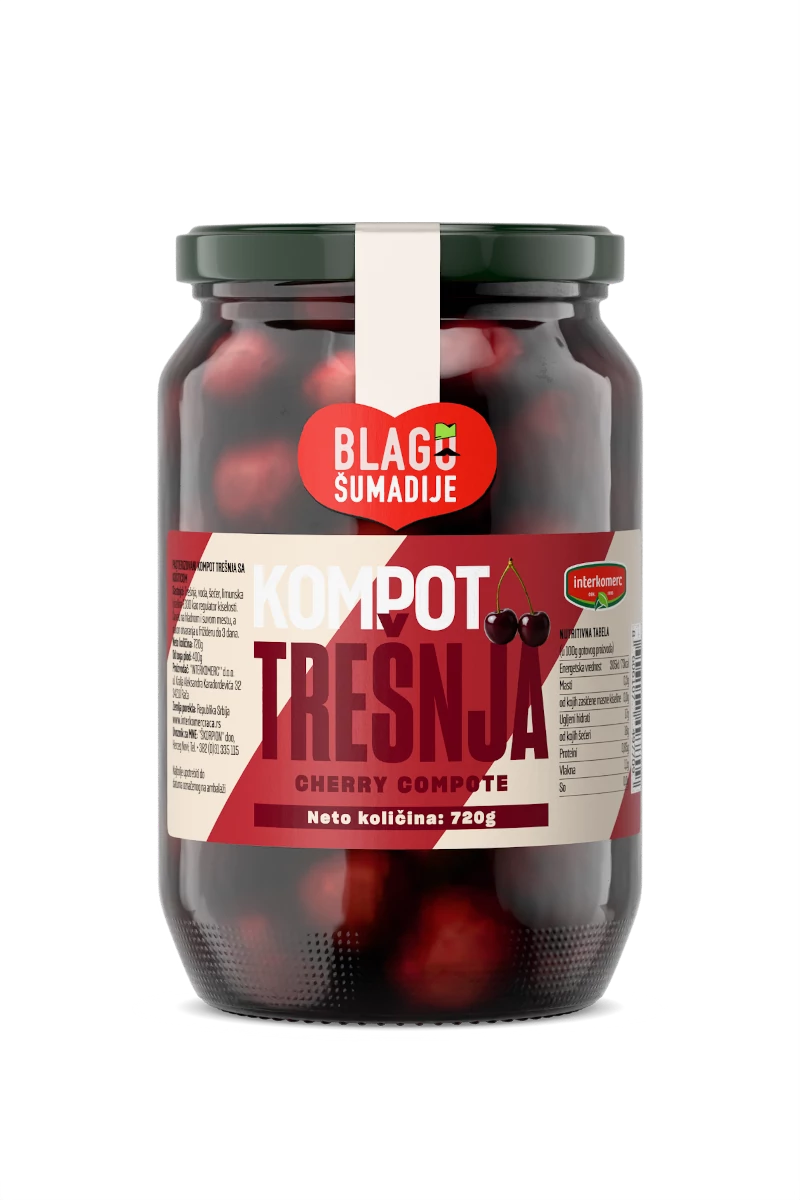 Kompot od domaće trešnje sa košticom, manje sladak, pasterizovan, 720 g.