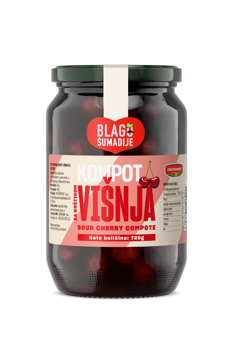 Kompot od domaće višnje sa košticom, manje sladak, pasterizovan, 720 g.