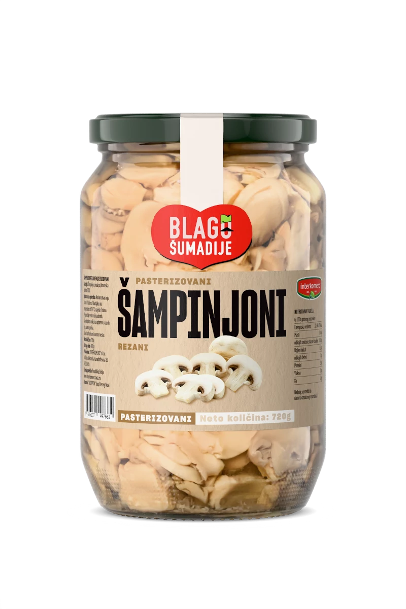 Pasterizovani rezani šampinjoni, domaći, spremni za upotrebu, 720 g.